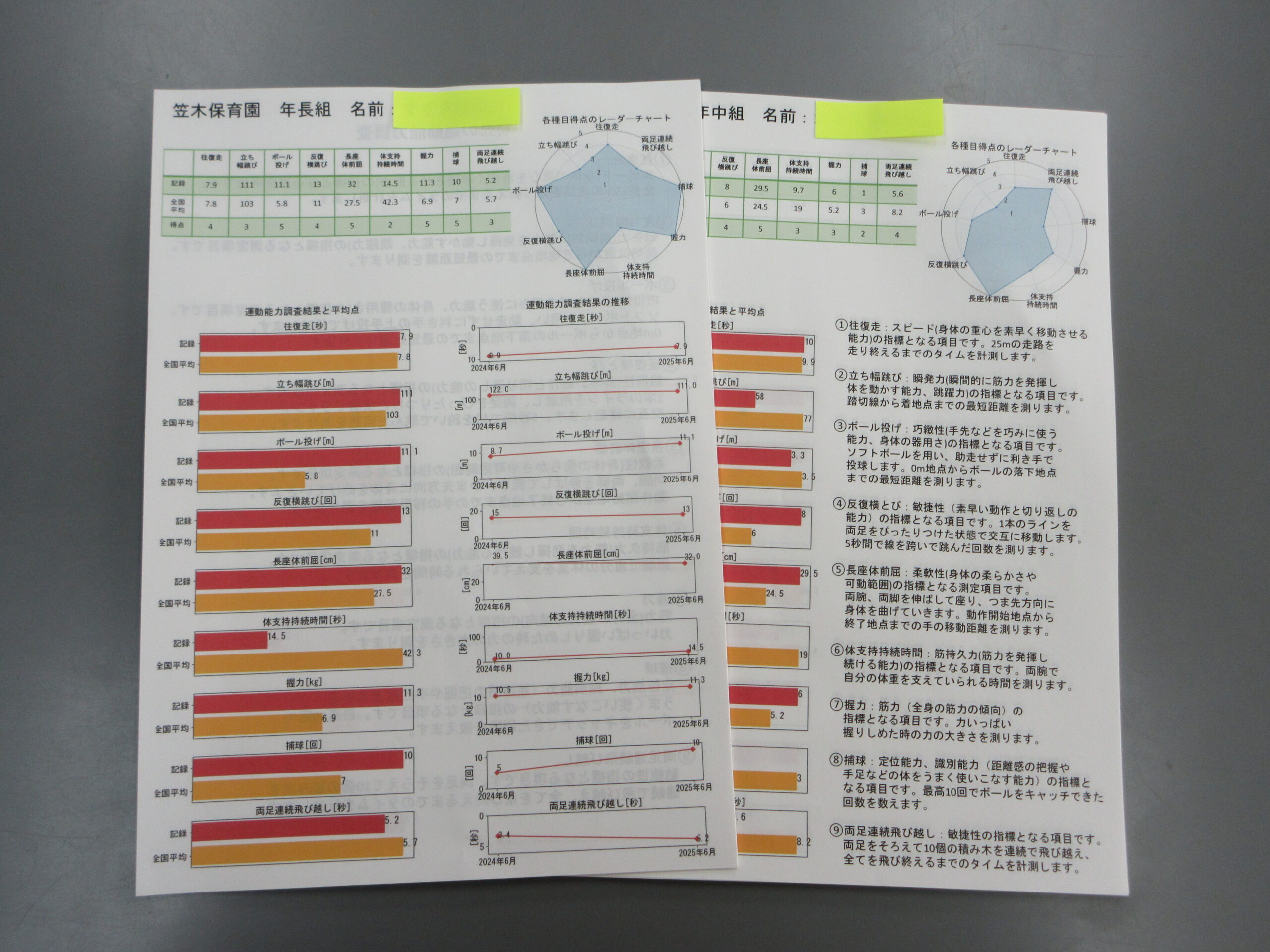 体力・運動能力測定の結果 2025.12.24 園の生活アラカルト まつ・たけ・うめ組さんが行った体力・運動能力測定の結果が届きました。 一人ひとりの測定記録や全国平均。まつ組さんは昨年度からの推移が記載された表を持ち帰ります♪ 得意分野や頑張りポイントなど、ご家族でぜひご覧ください(*^▽^*)