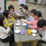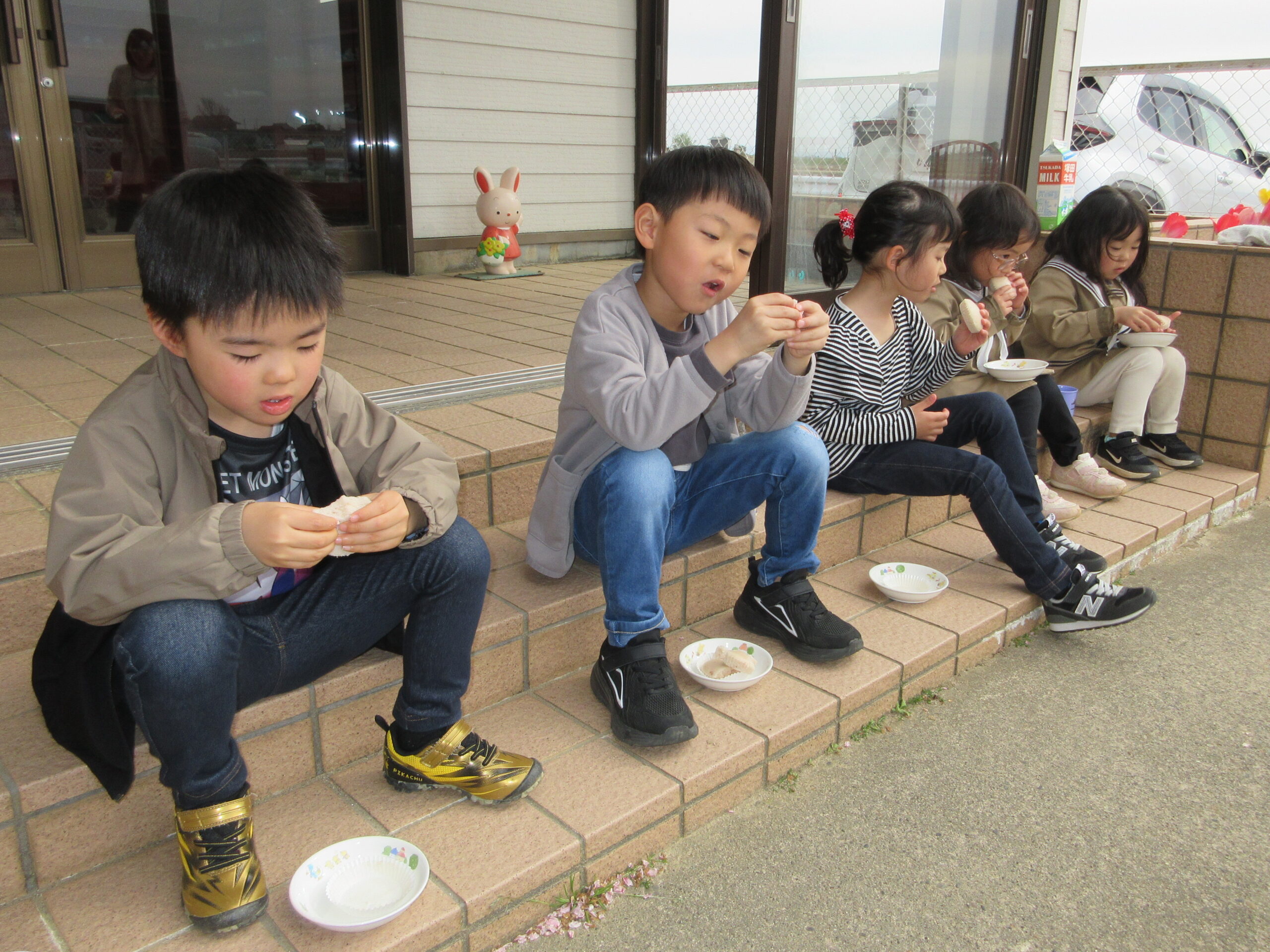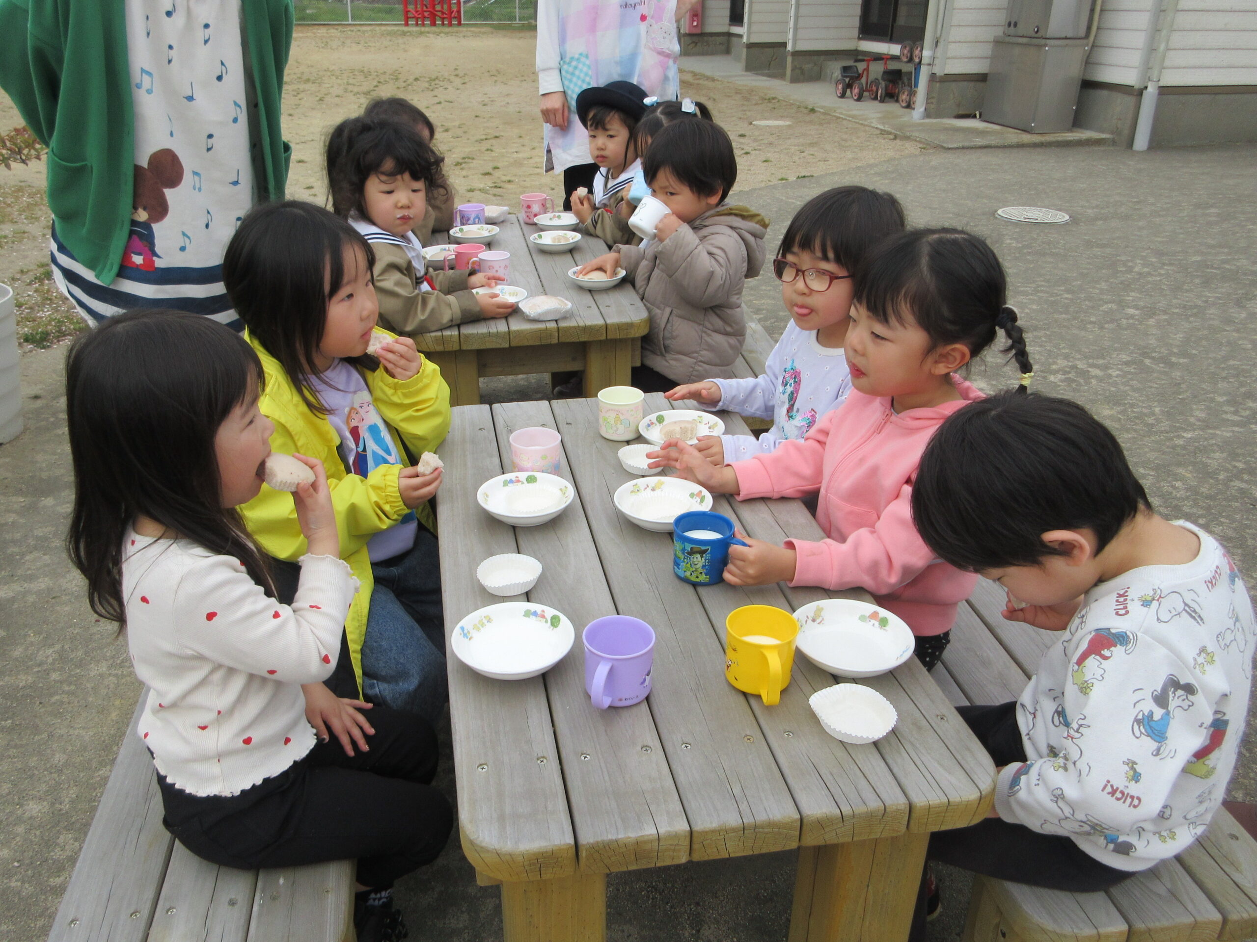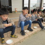 穏やかな陽気に誘われて、まつ・たけ・うめ組さんがお外でおやつを食べましたσ(*^~^*)