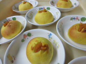 カボチャのペーストを混ぜ込んだ生地に、かぼちゃの餡を包んで焼き上げました((▲◡▲))
