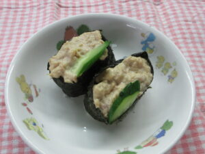 ご飯に海苔を巻き、ツナマヨをのせ、キュウリまで添えてあります♡