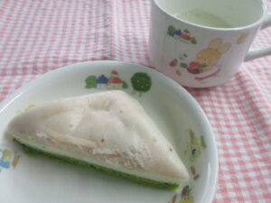 三色蒸しパンとカルピス 2026.03.03 おやつ 3月3日は桃の節句。ひなまつりのおやつは菱餅と白酒をイメージした三色蒸しパンとカルピスです(o^ー^o) イチゴジャムとプレーンと抹茶の生地は、それぞれ蒸して重ねたので綺麗な層に仕上がっています♪